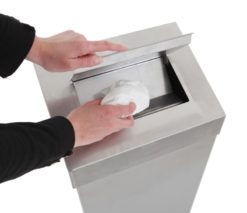 Afvalbak van RVS of aluminium voorzien van hygiënische top waardoor de inhoud van de bak aan het zicht onttrokken wordt. Geschikt voor wandmontage.