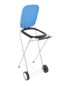 Mobiele afvalzakhouder bestaande uit een gegalvaniseerd buizenframe en gekleurd kunststof deksel. De deksel opent eenvoudig door op de Push knop te klikken. Voorzien van twee polypropyleen wielen, maakt verplaatsen makkelijk. Met kunststof afvalzakhouderring onder het deksel en metalen bodemrooster dat er voor zorgt dat de afvalzak netjes op zijn plaats blijft bij het verrijden.