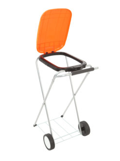 Mobiele afvalzakhouder bestaande uit een gegalvaniseerd buizenframe en gekleurd kunststof deksel. De deksel opent eenvoudig door op de Push knop te klikken. Voorzien van twee polypropyleen wielen, maakt verplaatsen makkelijk. Met kunststof afvalzakhouderring onder het deksel en metalen bodemrooster dat er voor zorgt dat de afvalzak netjes op zijn plaats blijft bij het verrijden.