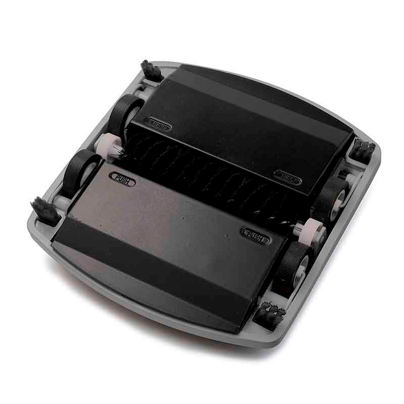 Compacte veger van duurzaam gegalvaniseerd staal en robuust ABS-plastic om gemakkelijk in de kleinste hoekjes te komen. Veegpad van 16,5 cm (één borstel) voor gladde vloeren of laagpolige tapijten. Voorzien van een makkelijk te openen vuilreservoir (0,4 liter), zacht rubberen wielen, hoekborstels en beschermende voor- en achterbumper. Steellengte 101,6 cm. Ideaal daar waar een stofzuiger geen optie en/of niet voor handen is.